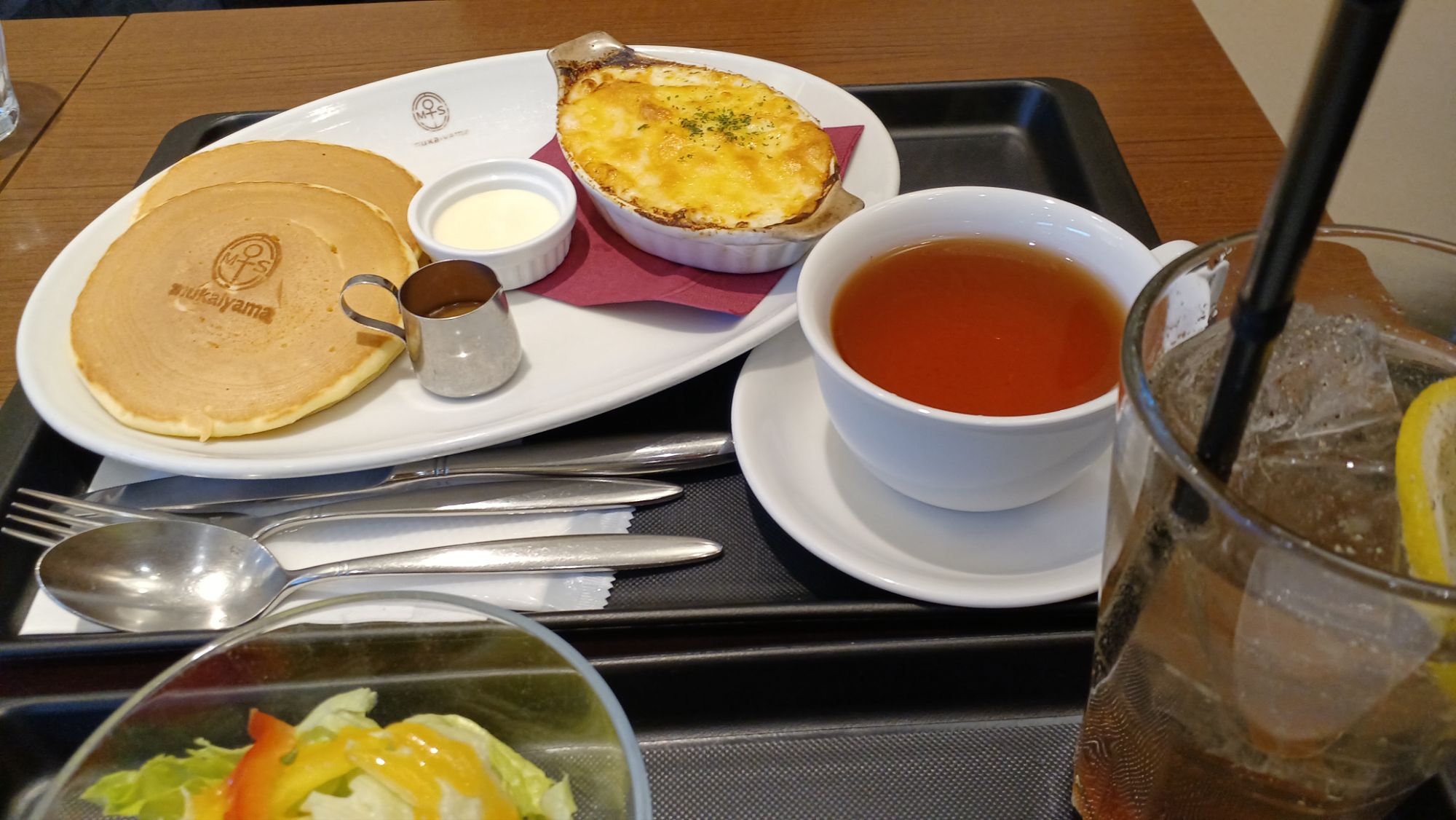 諦めかけていたランチ、郡山駅1階の向山製作所カフェでパンケーキ・グラタンセット半分こ、二人で2220円 自家製コーラがスパイスが効いてて◎(うまい)