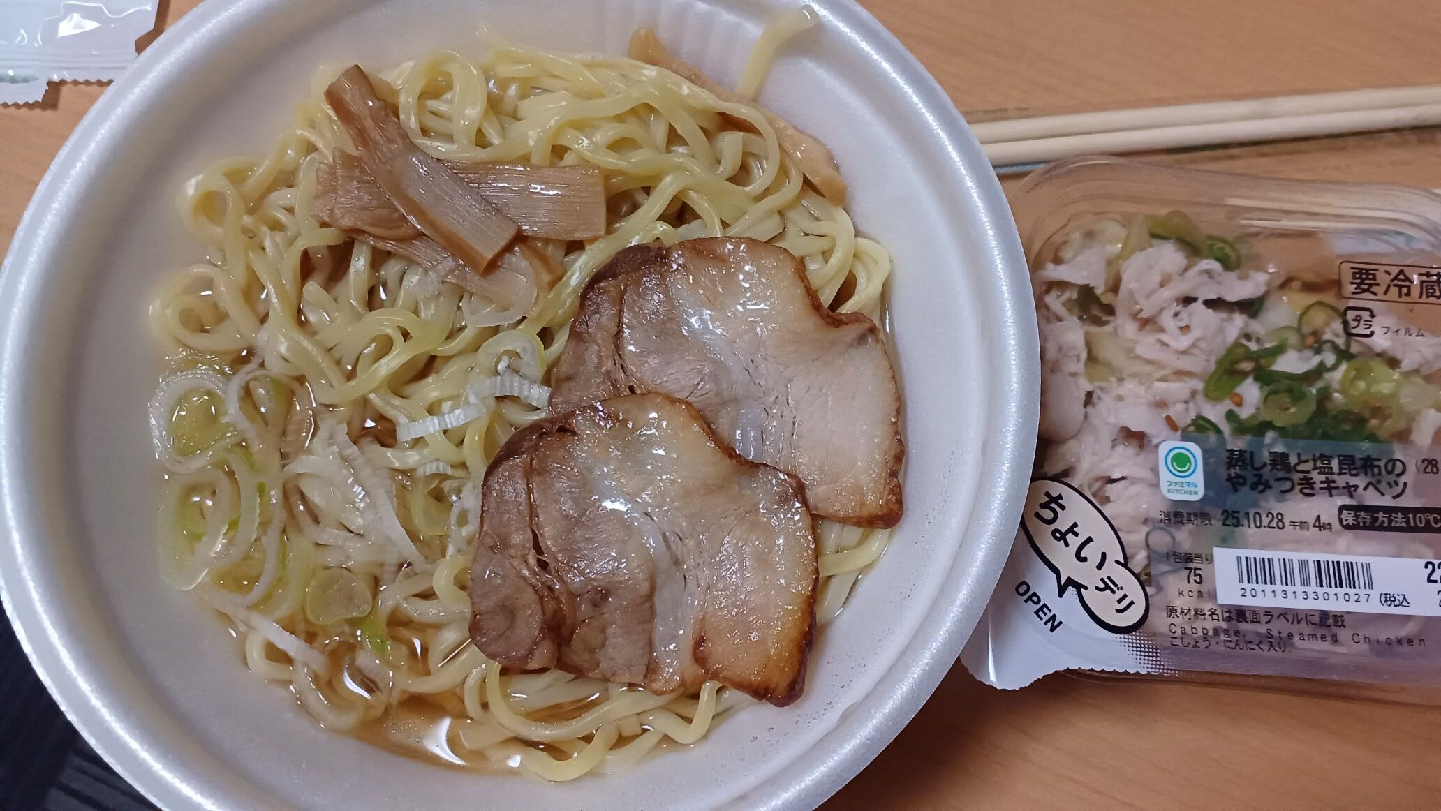 宿にチェックイン、夕飯は部屋でファミマの喜多方ラーメン!(夫は駅弁のずうずう弁)