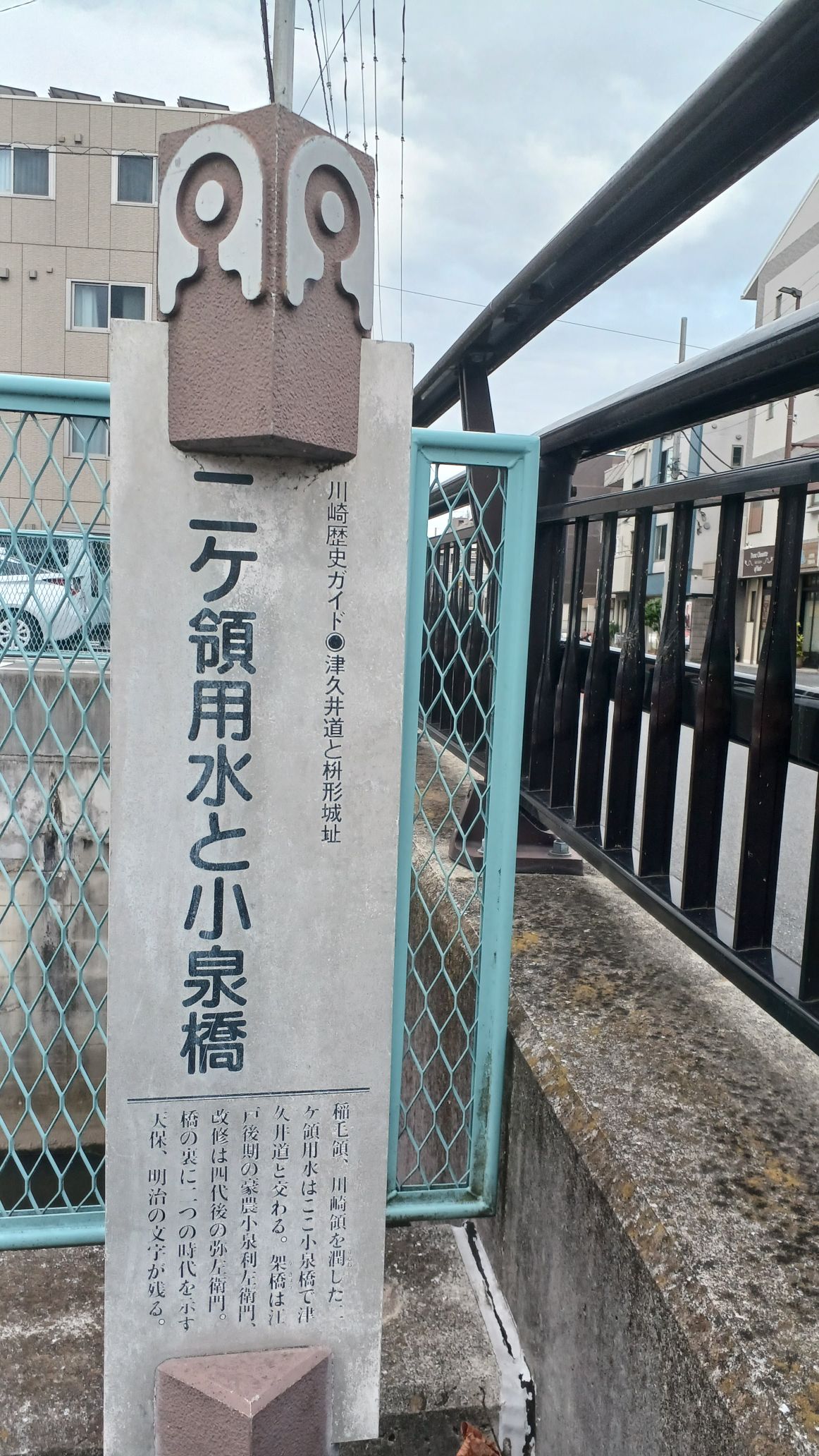 多摩脳神経外科の先、小泉橋のたもとには、歴史ガイドが建っています。