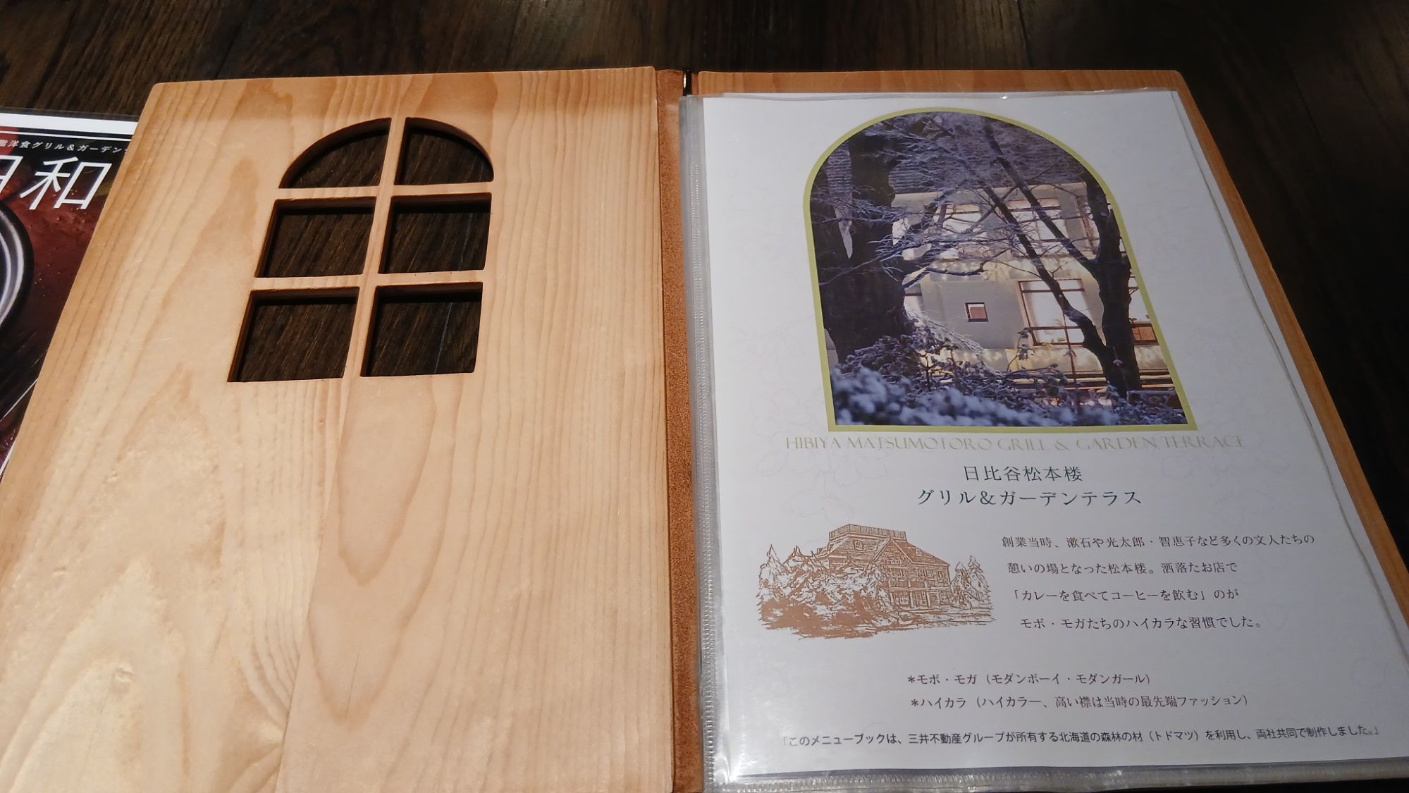 メニューの表紙が、木製でした!おお~。(布製もあるから2パターンあるみたい)