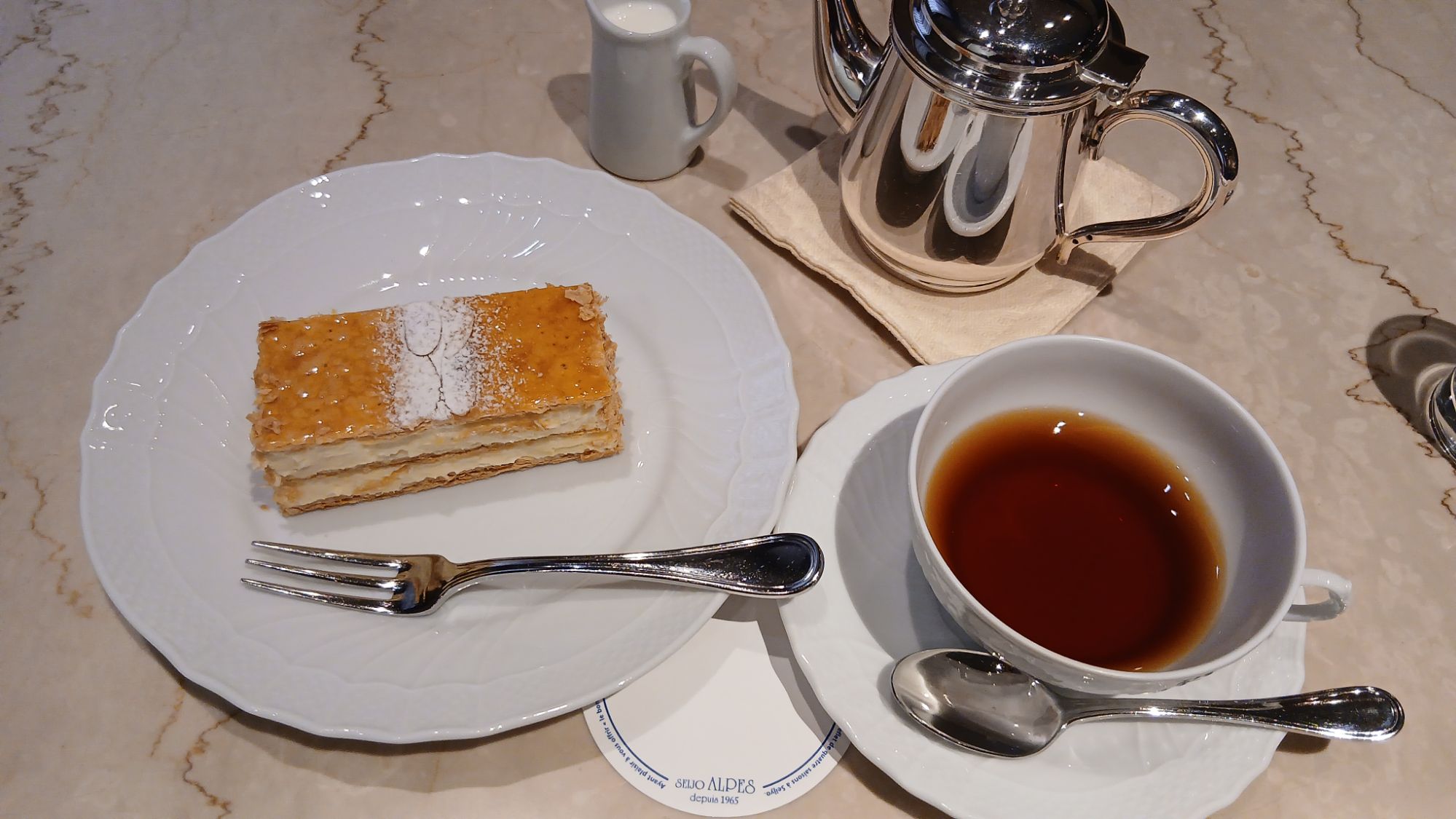 成城ALPSで、沼っている所得税の譲渡所得の調べ読み。オリジナルブレンド紅茶をミルクでいただきまして、ええいっナポレオンケーキも注文だ!調子に乗るんだ!1353円。