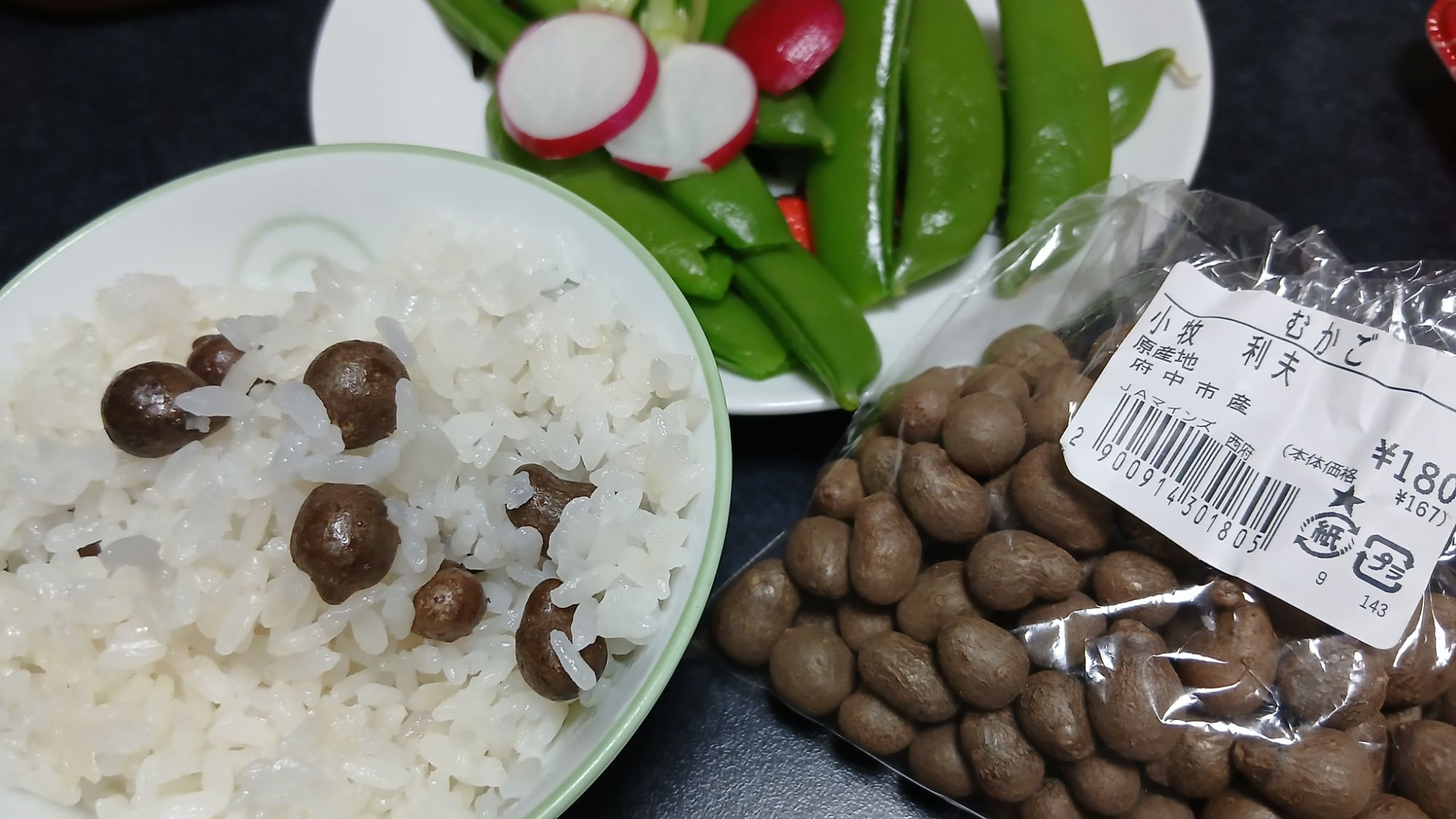 むかご180円。珍しいの売ってます!むかご料理は下記。むかごごはん、簡単で美味しい・・・・。皮が薄くて歯ごたえが良く、中身はナガイモだからフワッと♡口の中でほのかな野菜の香りが好きっ(当該生産者さん、広報誌「まいんず」によるとサトイモ部門で入賞されてました)