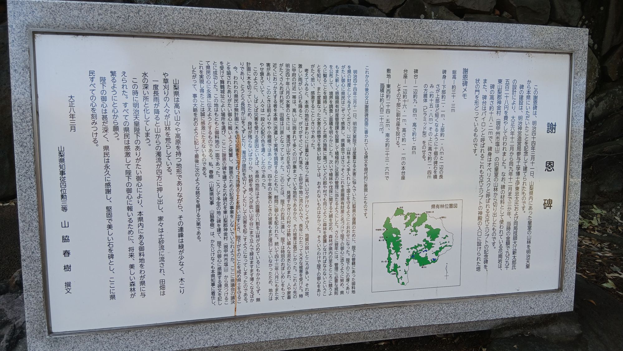 明治44年3月11日。山梨県内にあったご皇室の山林を明治天皇から本県にいただいたことを記念して建てられたものだそうなのです。